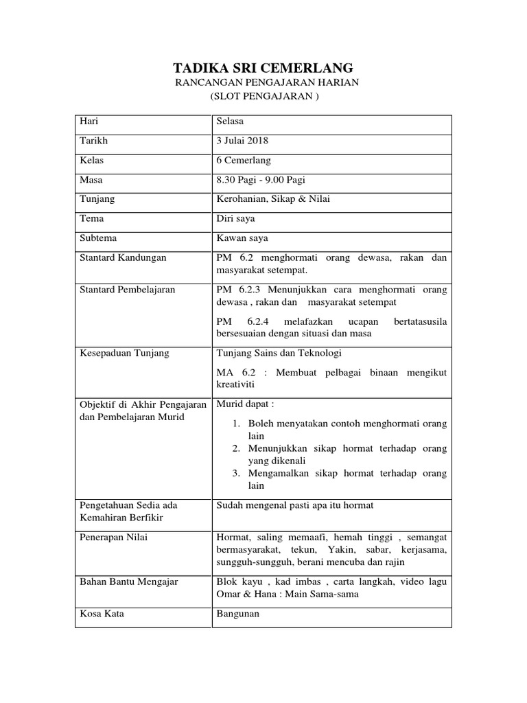 Murid tema rancangan pengajaran harian : Dalam rancangan pengajaran harian (rph) yang telah kami sediakan, kami telah kumpulan kami telah 3 teknik dan kaedah pengajaran yang sering di laksanakan di prasekolah. Prasekolah bestari sk teluk medan. Saya menjalankan aktiviti melukis anggota badan. Rancangan pengajaran harian bahasa melayu tahun 5. Membuat refleksi tentang apa yang telah dipelajari. Please copy and paste this embed script to where you want to embed. Faedah bersukan (memenuhi masa lapang) tajuk kurikulum standard prasekolah kebangsaan (kspk) bahagian pembangunan kurikulum peneraju pendidikan negara latar belakang sejarah. Kreativiti dan estetika kandungan : Rph ini mengenai deria rasa iaitu masam, manis, pahit dan sebagainyafull description. Please fill this form, we will try to respond as soon as possible. 25 orang umur pelajar : Mendengar, bertutur, membaca, menulis guru :